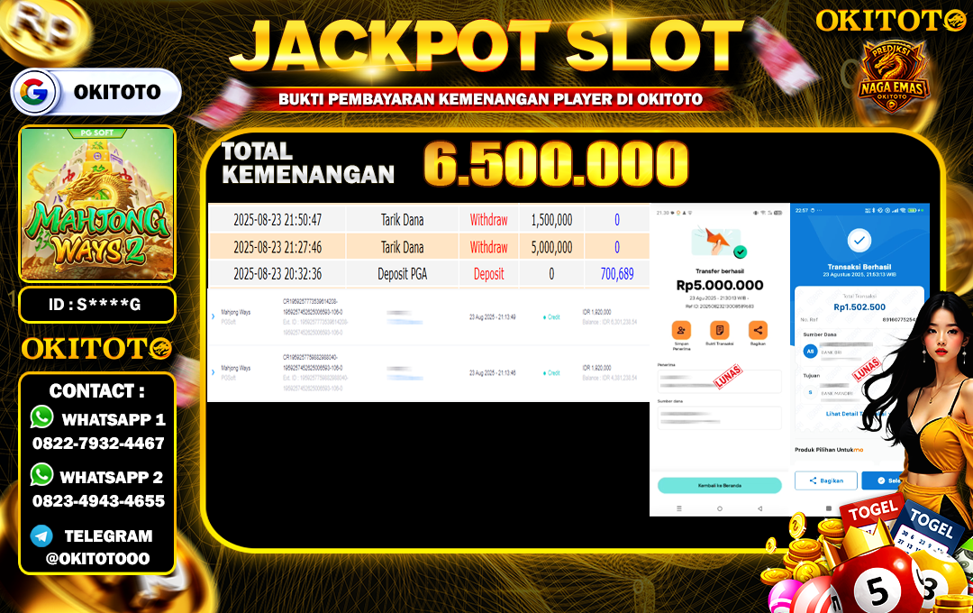 Berikut adalah bukti bahwa OKITOTO mempunyai integeritas yang tinggi dan dapat dipercaya semua orang, bukti jackpot berikut juga merupakan pembuktian yang kuat dan dapat dipertanggung jawabkan oleh pihak OKITOTO. Selamat kepada member kami dengan user id S****G telah memenangkan jackpot di situs okitoto.