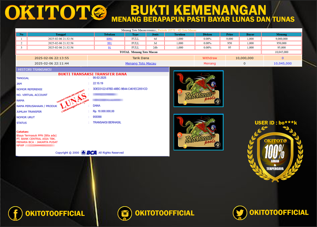 Berikut adalah bukti bahwa OKITOTO mempunyai integeritas yang tinggi dan dapat dipercaya semua orang, bukti jackpot berikut juga merupakan pembuktian yang kuat dan dapat dipertanggung jawabkan oleh pihak OKITOTO. Selamat kepada member kami dengan user id  bo***k telah memenangkan jackpot di situs okitoto.